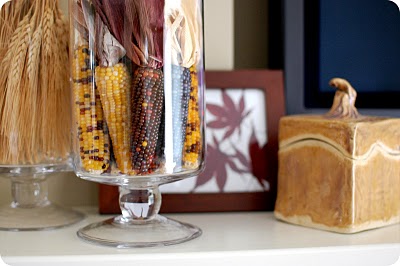 I LOVE the display with the Indian corn in the hurricane vase. WOW! So simple but so elegant. I could do that, but I had a mean little mouse rodent sneak into my basement and eat all my Indian corn. I try not to be bitter…..stupid mouse.